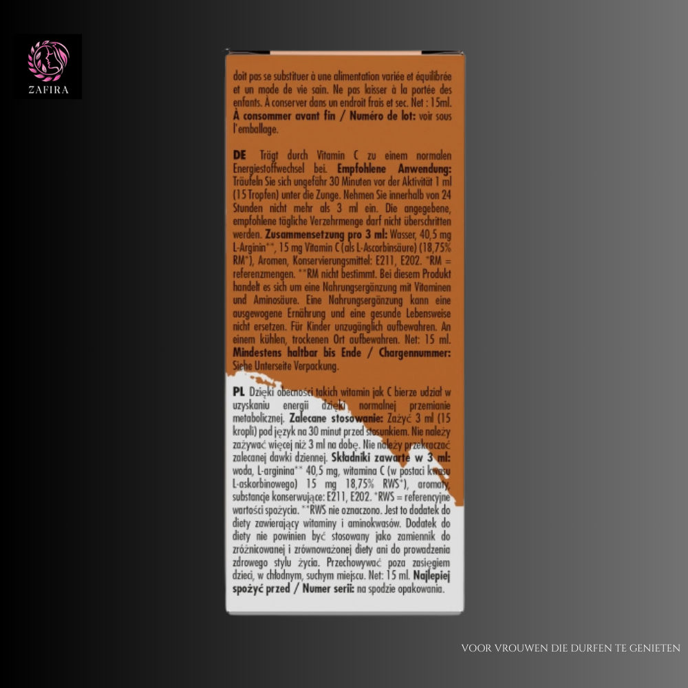 This unique energizing product naturally promotes sexual performance. The drops are easily and quickly absorbed by the body and contribute to a sexual impulse. The balanced formula makes use of the properties of the ingredients L-arginine HCL and Vitamin C. Vitamin C also ensures the proper functioning of the nervous system and promotes the body's energy metabolism. This can benefit stamina and so can sexual energy, allowing for more intense sexual desire to be experienced. The product has an exciting cola flavor and thus ensures more pleasure.