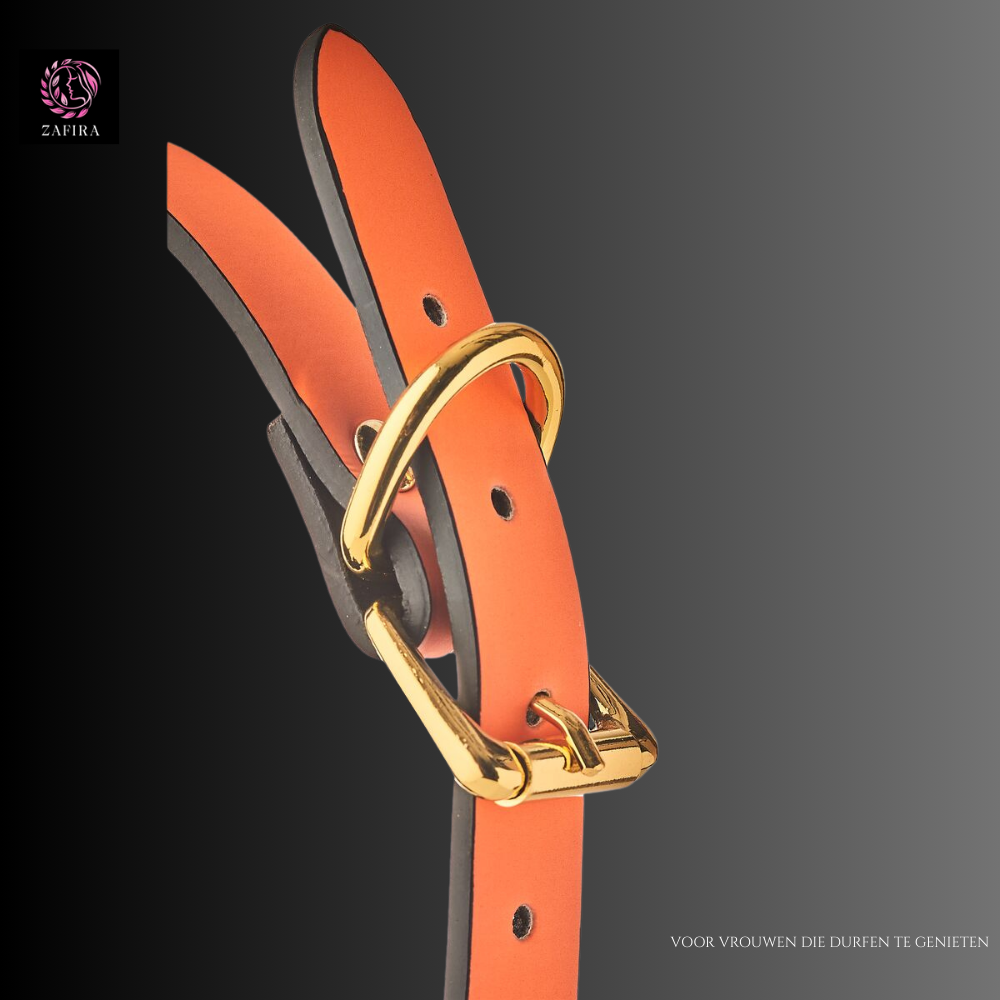 De blinddoek in opvallend oranje voegt een speels en stijlvol accent toe aan intieme momenten. Dankzij de diameter van 7 cm sluit hij comfortabel aan, waardoor je volledig kunt opgaan in het spel. Perfect voor wie elegantie en spanning op een verfijnde manier wil combineren.